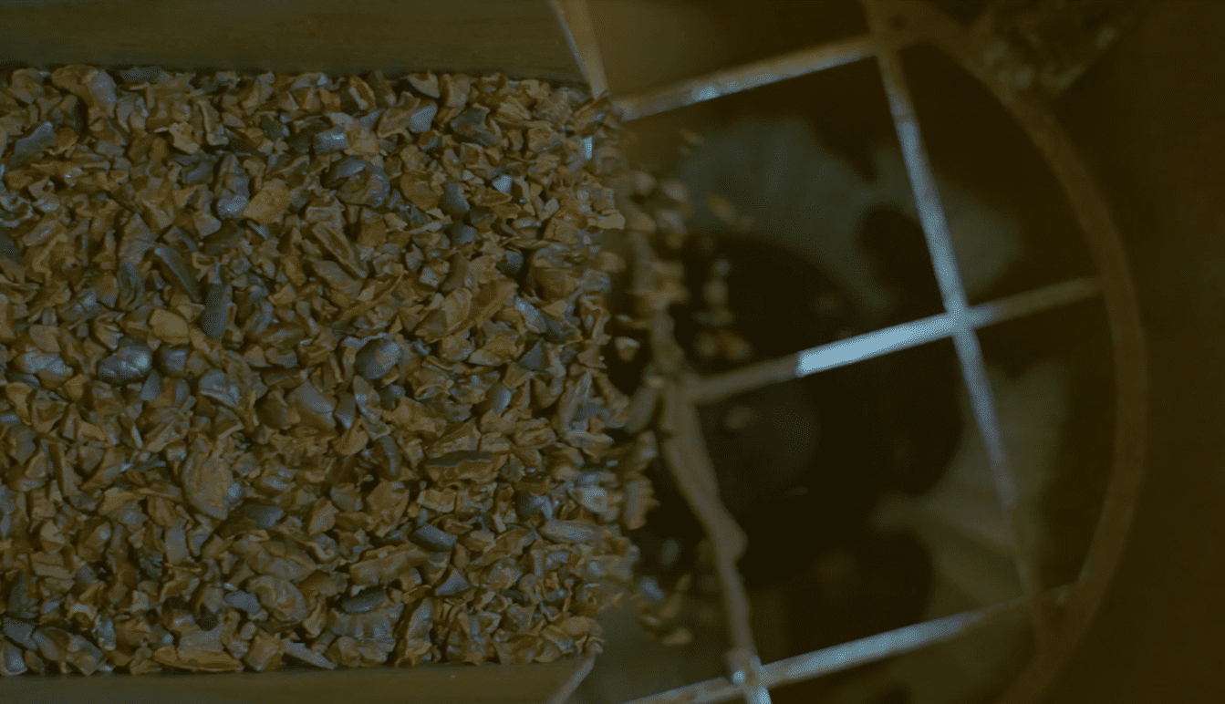 Les fèves torréfiées passent dans un moulin mécanique lors de l’étape du concassage. Ce procédé permet de séparer les grains de cacao de leurs coques. Après cette opération, un tamisage est réalisé, afin d’expulser les résidus de coques, grâce au soufflage d’un courant d’air chaud.
