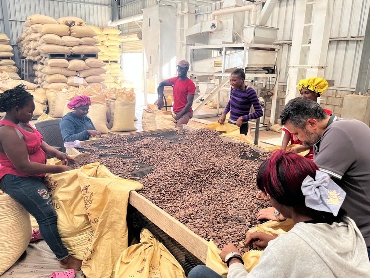 À cette étape, les cultivateurs n’ont pas encore fini de veiller aux grains ! C’est ici qu’intervient le séchage des fèves de cacao. Ces dernières sont étalées sur de grands séchoirs, en extérieur, qui sont exposés au soleil. L’objectif de ce processus est de faire perdre aux fèves 90% d’humidité afin de pouvoir les conserver. Les graines de cacao sont étalées le plus possible pour garantir un séchage homogène entre elles, mais ce phénomène naturel ne doit pas être trop lent afin d’éviter le développement de moisissures suite à l’étape de fermentation, ni trop rapide sous peine de développer un taux d’acidité trop élevé dans les fèves. C’est pourquoi les producteurs brassent régulièrement les grains avec de grands râteaux, ce qui évite une exposition trop forte au soleil sur certaines faces. L’étape du séchage dure entre 1 et 2 semaines, en fonction des conditions météorologiques, comme les températures extérieures et le niveau du taux d’humidité. Lors de la saison des pluies, une période de l’année durant laquelle les fruits du cacaoyer peuvent arriver à maturité puisque cet arbre peut fleurir toute l’année, les séchoirs sont couverts de bâches imperméables, ou bien les fèves sont rentrées en intérieur dans des séchoirs artificiels. Lors de cette étape, la fève développe davantage son arôme de cacao, et va prendre une couleur brune beaucoup plus prononcée. Mais comment savoir que les graines de cacao sont correctement séchées ? Grâce à un appareil, leur taux d’humidité est contrôlé, si ce dernier est inférieur à 8%, les fèves sont prêtes à partir dans le commerce. D’abord stockées dans des sacs en toile de jute, les fèves de cacao sont ensuite acheminées vers les commerces où elles peuvent être vendues brutes, ou bien vers les laboratoires des professionnels qui vont les transformer en chocolat.