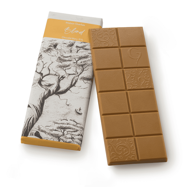 Il faut utiliser une base de beurre de cacao, à laquelle on ajoute du sucre et du lait en poudre. Pour qu’un produit soit commercialisé sous l’appellation “chocolat blanc” en France, selon le décret n°2003-702 du 29 juillet 2003, il doit contenir au minimum 20% de beurre de cacao et 14% de produits laitiers, dont 3,5% de matière grasse lactique. C’est par exemple le cas de notre tablette de chocolat blanc, dans laquelle nous faisons le choix d’ajouter du beurre et du lactoserum afin d’accentuer l’aspect crémeux de cette douceur. Il s’agit de produits laitiers que peut ajouter le chocolatier, sans obligation légale particulière. Le dosage du sucre n’est pas soumis non plus à un encadrement législatif spécifique.
