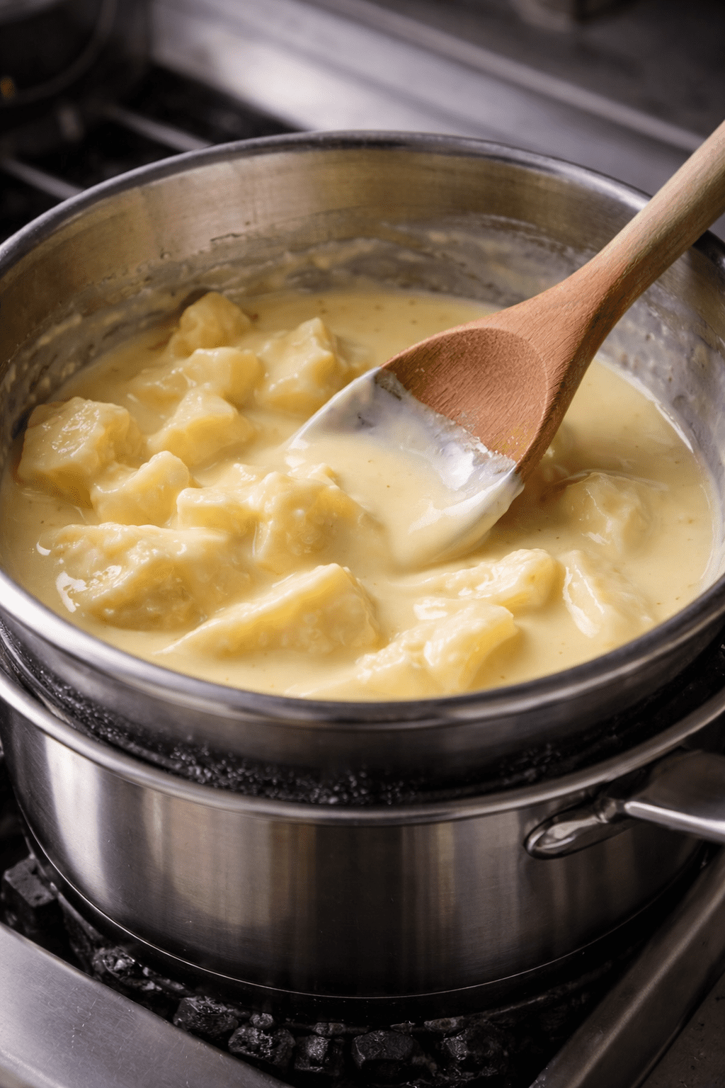 Faire fondre du chocolat blanc à la casserole en utilisant de la crème ou du lait, la solution des gourmands pour obtenir une texture lisse et onctueuse :