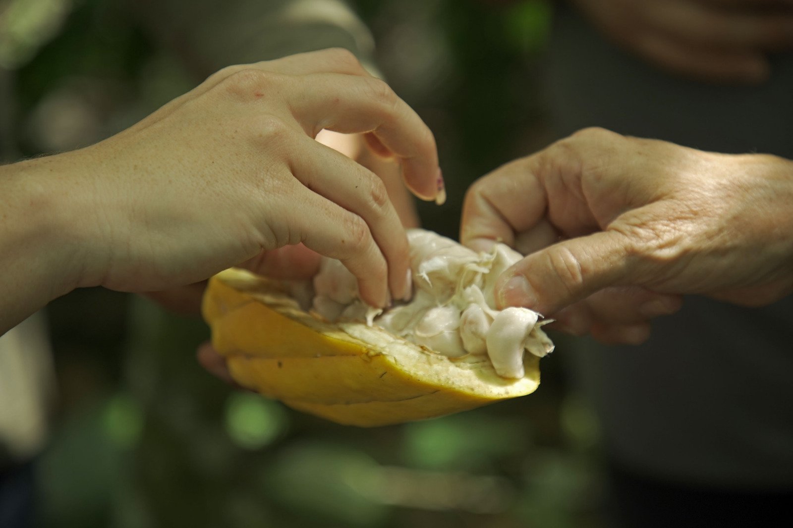 - Tout d'abord, le chocolat est composé majoritairement de cacao. Donc, à l'origine de ces douceurs chocolatées, l'on trouve un arbre, le cacaoyer. Ce dernier donne des fruits que l'on appelle les cabosses. Et dans ces cabosses mûrissent des graines, les fèves de cacao. Jusque-là vous nous suivez? Bien, poursuivons. Les cultivateurs récoltent les cabosses arrivées à maturité pour les ouvrir afin d'obtenir les graines de cacao. Après cela, les fèves de cacao connaissent des étapes de fermentation et de séchage pour développer l'arôme de cacao et favoriser leur conservation. Et hop! Direction le commerce, et notamment l'atelier de l'artisan chocolatier qui va directement travailler les fèves de cacao.