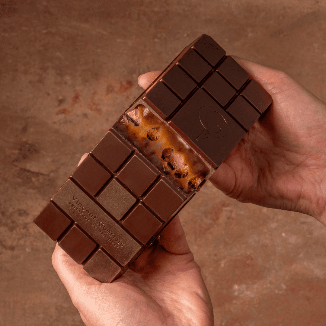 Et pour les amateurs de très grand format, difficile de résister à la CHOC XXL de chez Vincent Guerlais : une tablette de 250 g, enrobée de chocolat noir, garnie d'un gianduja aux noisettes, d'un caramel au beurre salé et de perles craquantes.