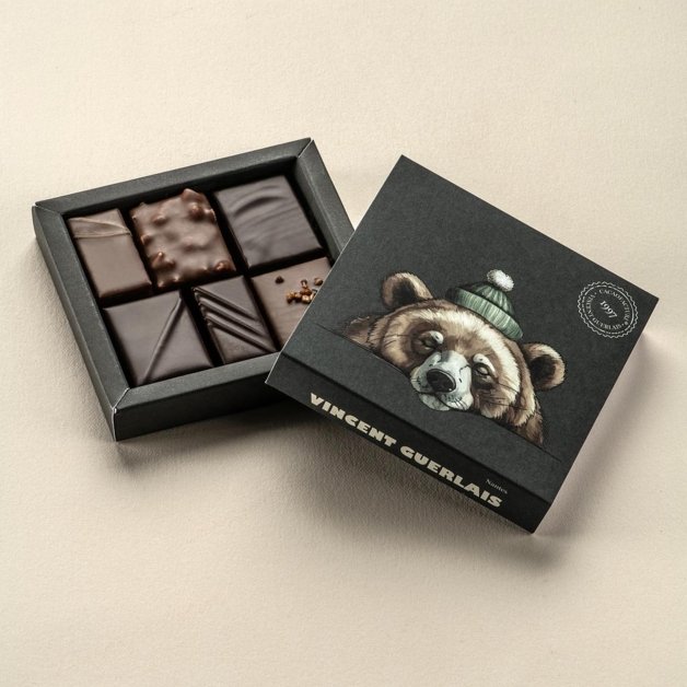 À l’intérieur, un assortiment délicat de bonbons de chocolat, élaborés par Vincent Guerlais à partir de matières premières d’exception : amandes et noisettes pour des pralinés emblématiques, notes épicées de vanille, gingembre ou poivre Timut… et bien sûr, l’incontournable Roi des fêtes : le chocolat.