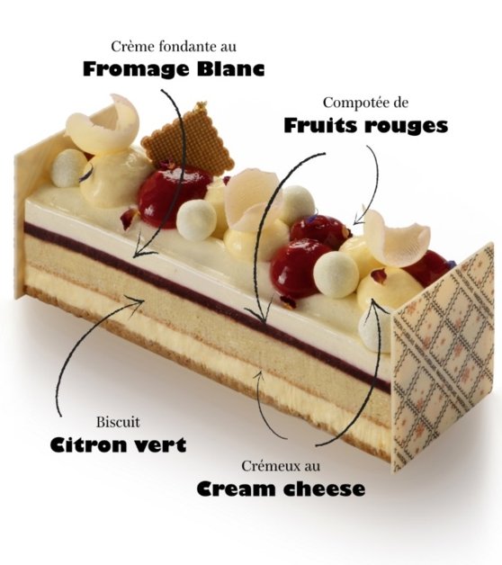 Ingrédients : Purées de fruit (fraise mara des bois, citron vert, citron jaune, yuzu, cassis, myrtille, framboise), CREME (Crème de LAIT, stabilisant : carraghénanes (extrait d’algues marines)), OEUFS, Fromage frais pasteurisé (LAIT, CREME, protéines de LAIT, LACTOSERUM, sel, stabilisant : E410, acidifiant : E330.), Sucre, BEURRE, Eau, Farine de BLÉ, AMANDES, Fromage blanc, Sucre glace (sucre, anti-agglomérant : amidon de maïs), Chocolat blanc (Sucre, beurre de cacao, poudre de LAIT, émulsifiant : lécithine de SOJA), Miel, Gélatine de boeuf, Fécule de pomme de terre , Pectine, Zestes de citron, Agent de levage : Poudre à lever E450, E500 (amidon de froment), Huile de tournesol, LACTOSE, Agar agar, LAIT, Sel, Gousse de vanille, Epaississant: Gomme de guar et de xanthane, Cannelle, Fleur de sel