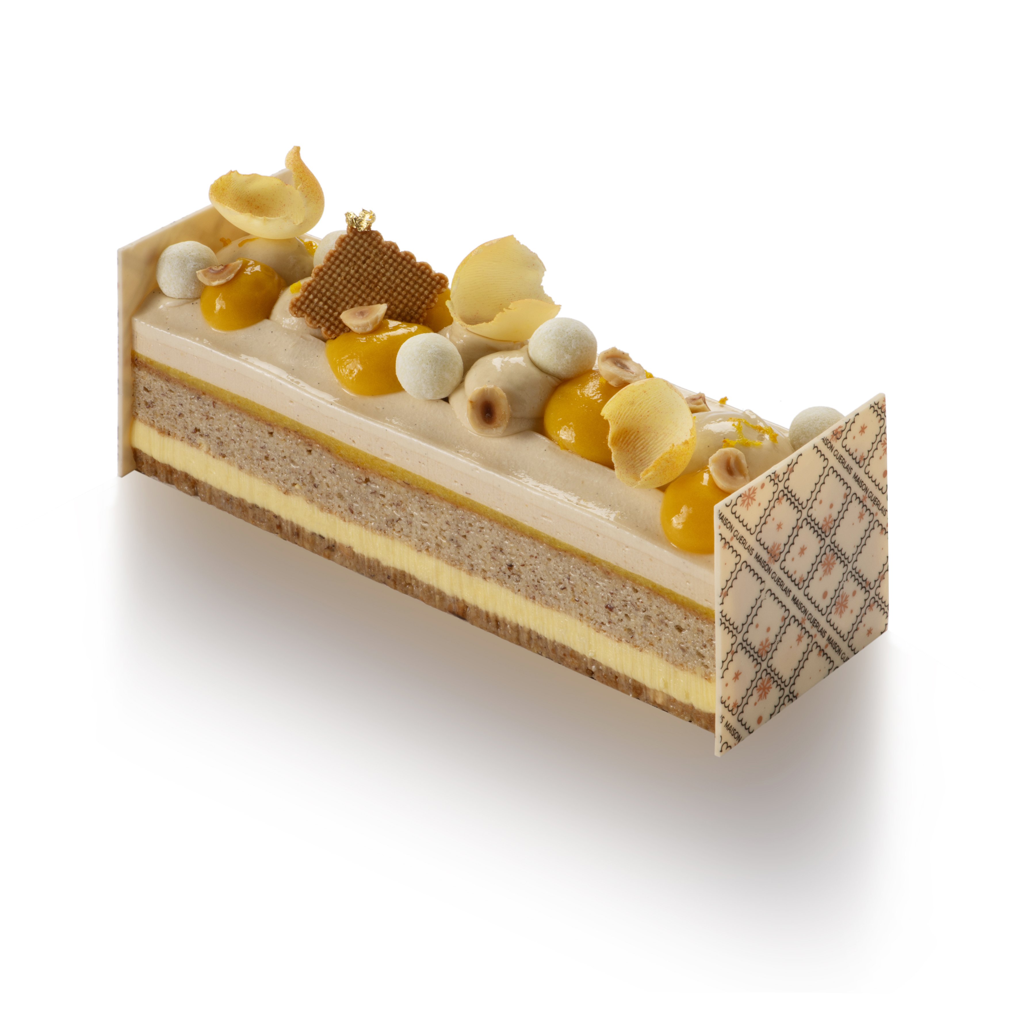 Une alliance audacieuse entre douceur et vivacité : croustillant noisette, biscuit moelleux à la noisette, crémeux orange–passion et compotée fruitée aux notes acidulées, enveloppés d’une mousse noisette délicate.