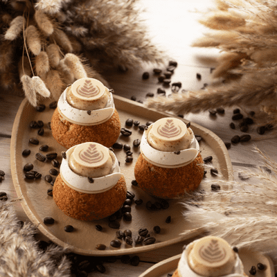 Sous une pâte à choux dorée, les notes torréfiées se dévoilent à travers un praliné aux grains de café, accompagné d’une crème onctueuse.