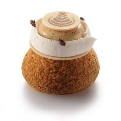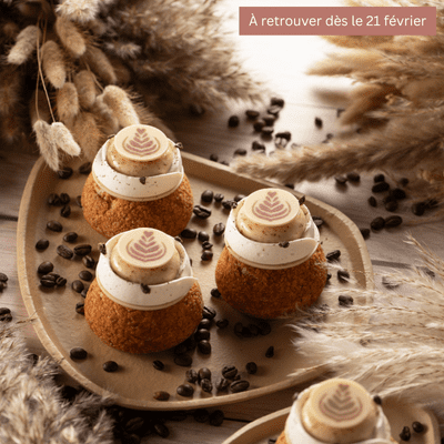 Sous une pâte à choux dorée, les notes torréfiées se dévoilent à travers un praliné aux grains de café, accompagné d’une crème onctueuse.