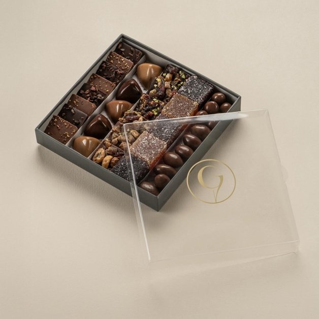 Un assortiment gourmand réunissant de savoureuses douceurs artisanales. Vous y trouverez de tendres pâtes de fruits, des mendiants au chocolat garnis de fruits secs, ainsi que des palets de chocolat noir au grué de cacao et au lait au sarrasin.