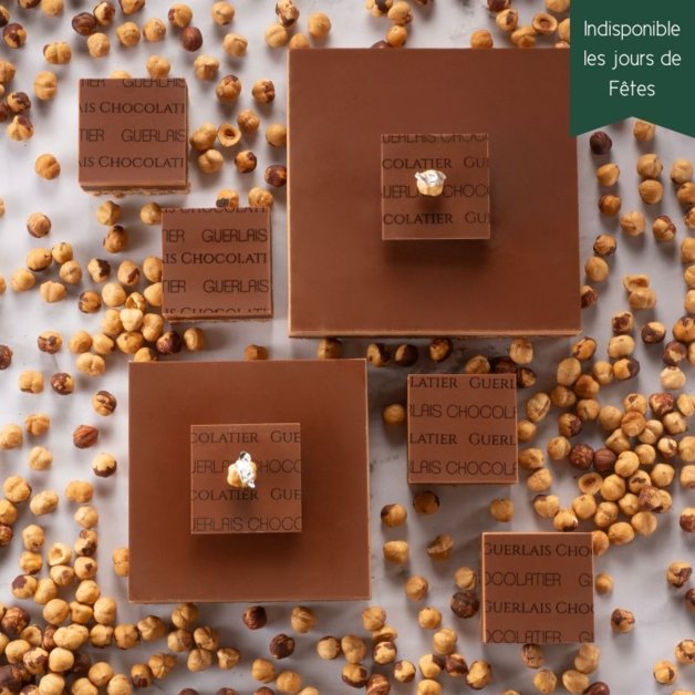 Ingrédients : Chocolat au LAIT (sucre, beurre de cacao, LAIT en poudre, fèves de cacao, émulsifiant : lécithine de tournesol, extrait naturel de vanille), CREME (LAIT, stabilisant : carraghénanes), OEUFS, Sucre glace (sucre, anti-agglomérant : amidon de maïs), NOISETTES, AMANDES, Sucre, Biscuit finement émietté (farine de BLE, sucre, BEURRE, LACTOSE, protéines deLAIT, sel, extrait de malt : ORGE, poudre à lever : E500ii), Sirop de glucose, BEURRE
