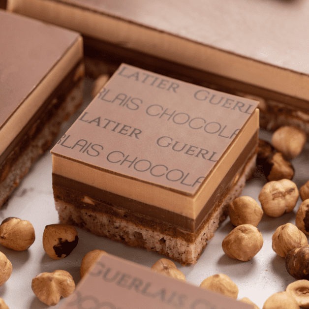 S'entremêlent croquant, fondant, croustillant et crémeux dans une alliance de saveurs gourmandes. Chocolat au lait, noisettes et praliné sont ici mis à l'honneur pour vous proposer une délicieuse variation de sensations.