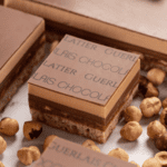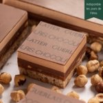 Dacquoise aux noisettes, praliné feuilleté, fines feuilles de chocolat au lait et ganache chocolat au lait.