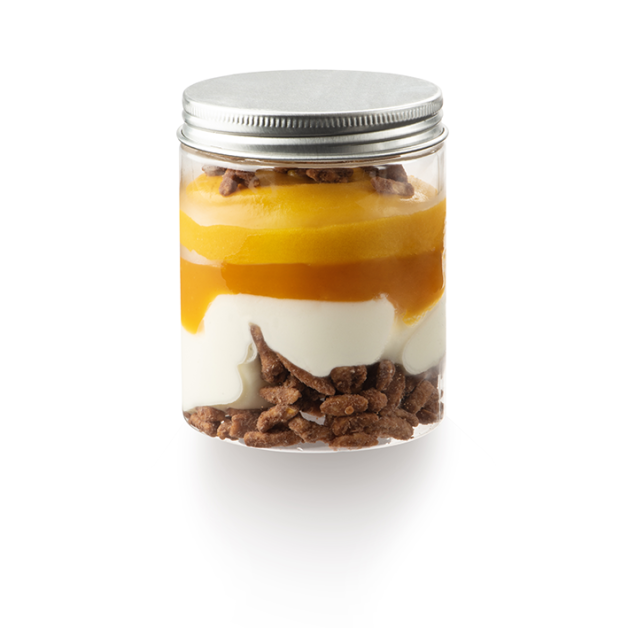 Ingrédients : Mangue, LAIT, Fruit de la passion, Sucre, AMANDES, crème liquide (LAIT, stabilisant : carraghénanes), Sirop de glucose déshydraté, Eau, Dextrose monohydraté, Chocolat au lait (sucre, beurre de cacao, LAIT entier en poudre, fèves de cacao, émulsifiant : lécithine de tournesol, extrait naturel de vanille), Poudre de LAIT, Huile de pépins de raisin, pectine, Fleur de sel, Gomme de guar et Caroube.