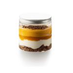 Un dessert exotique composé d'amandes bâtonnets enrobées de lait, accompagnées de crème glacée au lait, de gelée glacée à la passion et de sorbet à la mangue.