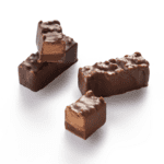 Tendre caramel à la fleur de sel et Gianduja aux noisettes sous une coque en chocolat noir ou lait.