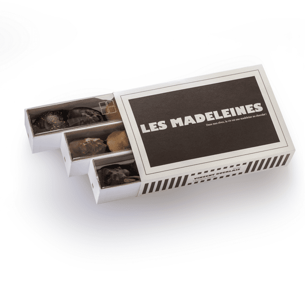 Vous retrouverez dans cette boite un assortiment de madeleines revisitées, où chaque recette joue sur l’équilibre entre moelleux, cœur fondant et enrobage chocolaté.