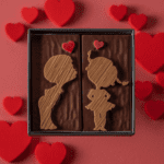 Sous un décor en chocolat au lait délicat inspiré de la Saint-Valentin, Vincent Guerlais réunit 2 généreuses bouchées au chocolat noir garnie d'un praliné craquant.