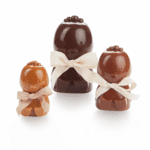 Craquez pour nos poussins en chocolat noir, lait ou blanc garnis d'un assortiment de fritures chocolatées et de toute une collection de petits œufs au chocolat.