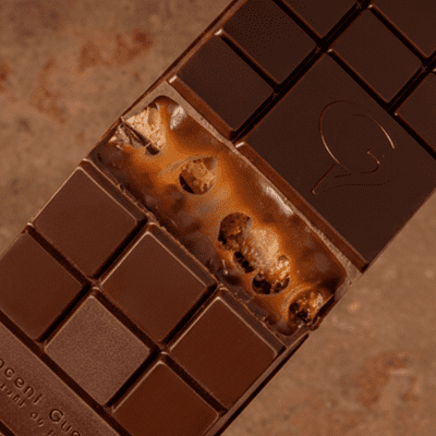 Enrobage chocolat noir garni d'un gianduja aux noisettes, d'un caramel à la fleur de sel et de perles craquantes.