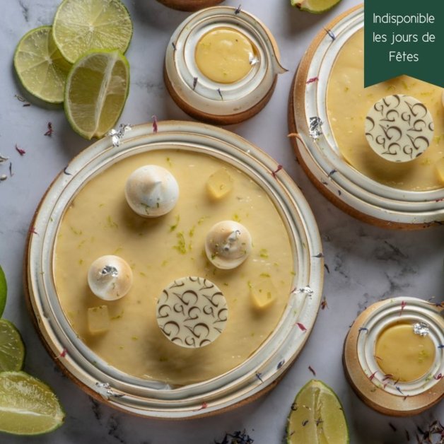 Pâte sucrée, confit de citron bergamote, crémeux de citron jaune et zestes de citron vert, meringue fondante.
