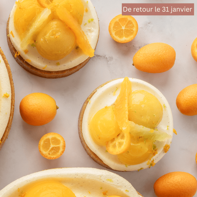 Sous une pâte sucrée croustillante, un biscuit madeleine moelleux imbibé de sirop citron yuzu apporte équilibre et légèreté. Un confit de mandarine et de citron vert révèle toute la vivacité des fruits, adoucie par un crémeux vanille onctueux.