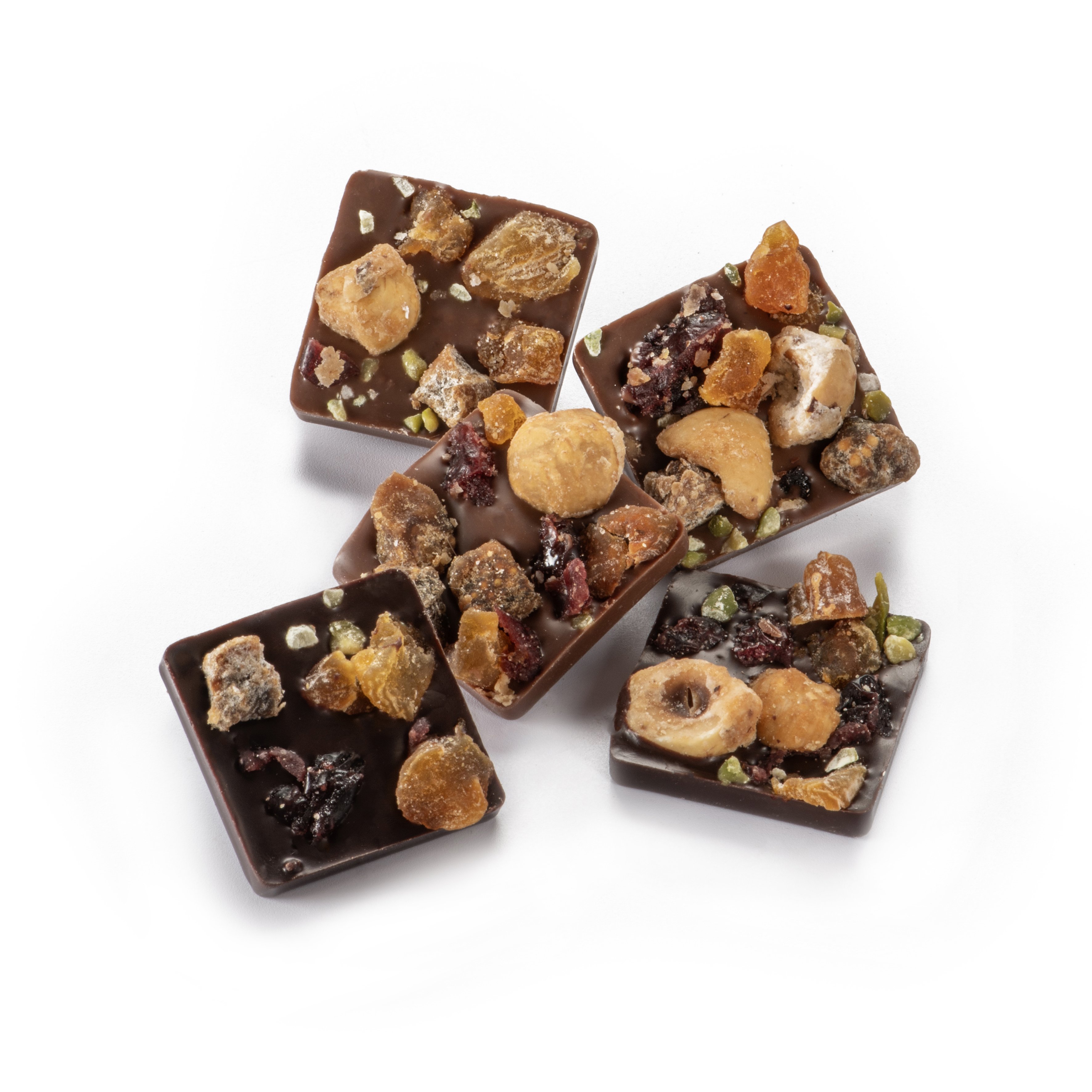 Palets de chocolat noir et lait aux fruits secs et confits.